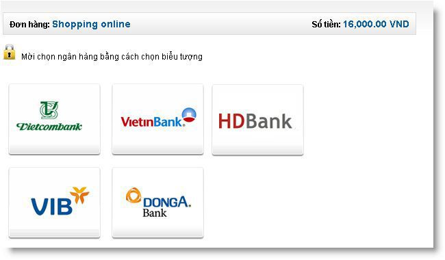 Chọn hàng hóa/ dịch vụ cần mua, hoàn thành đơn đặt hàng, sau đó chọn thanh toán với Thẻ ATM nội địa. Tiếp đó, chọn biểu tượng Vietcombank.