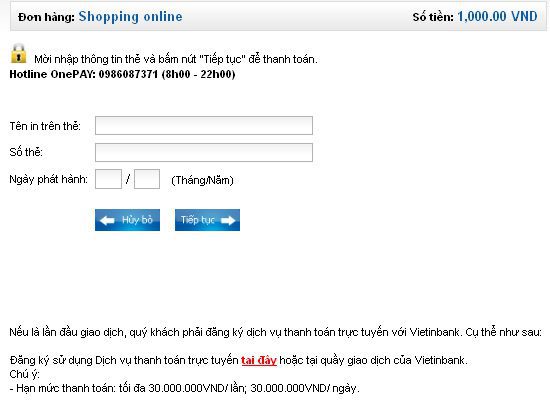 Kích “Tiếp tục” để thực hiện thanh toán. Thẻ của Quý khách đã được kích hoạt chức năng thanh toán trực tuyến và các thông tin đã nhập phải chính xác, số dư tài khoản đủ để thanh toán.