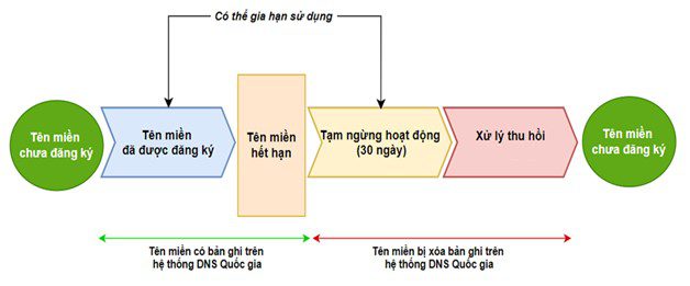 - Trạng thái tạm ngừng (30 ngày): Ngay sau ngày hết hạn, nếu chưa nộp phí gia hạn, tên miền bị khóa. Khách hàng có 30 ngày để nộp phí và khôi phục hoạt động.