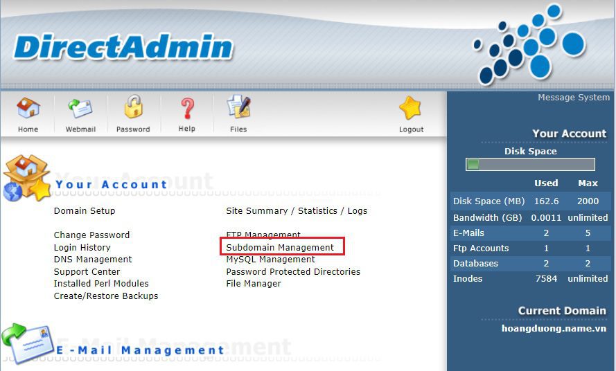 Truy cập đến Subdomain test.hoangduong.name.vn
